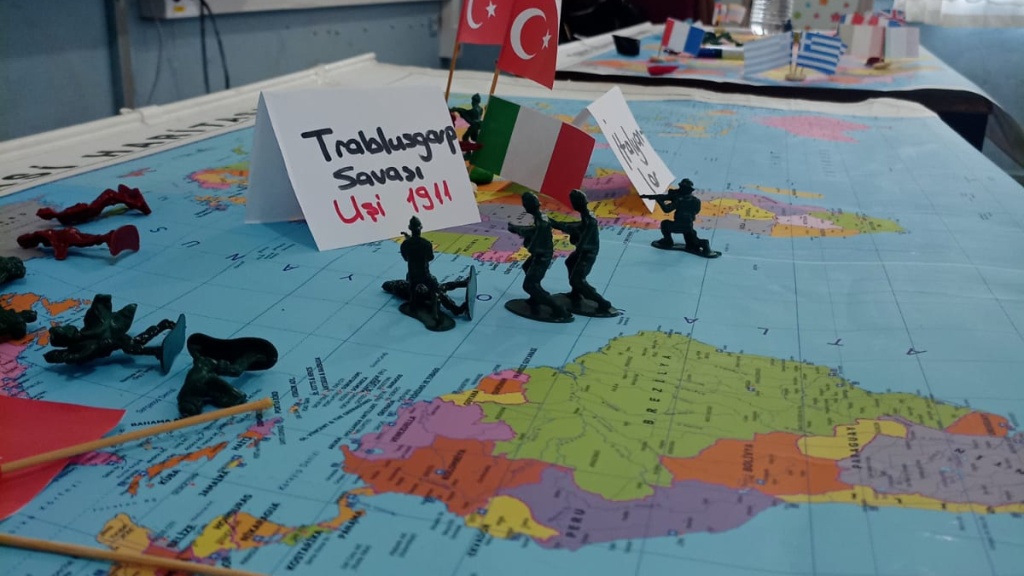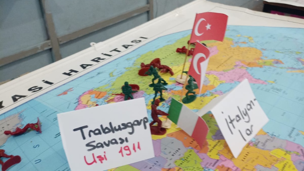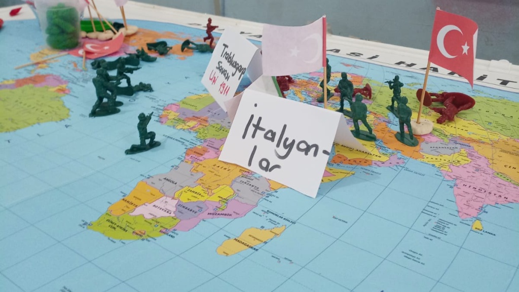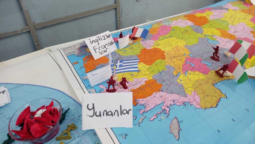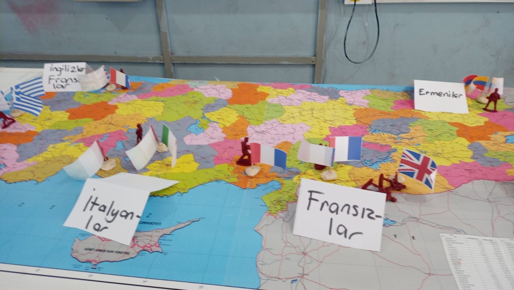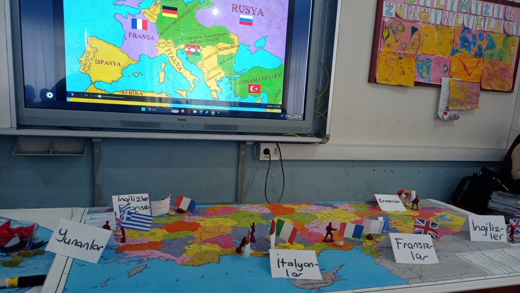 4. Sınıf Öğretmenimiz Feyza DENİZ, Millî Mücadele dönemi ve Millî Mücadele Kahramanlarımızı, hazırlamış olduğu mini bayraklar, mini askerler, küçük gemiler, Dünya ve Türkiye haritalarını kullanarak, eğlenceli, etkili ve kalıcı öğrenme sağlayarak anlattı.